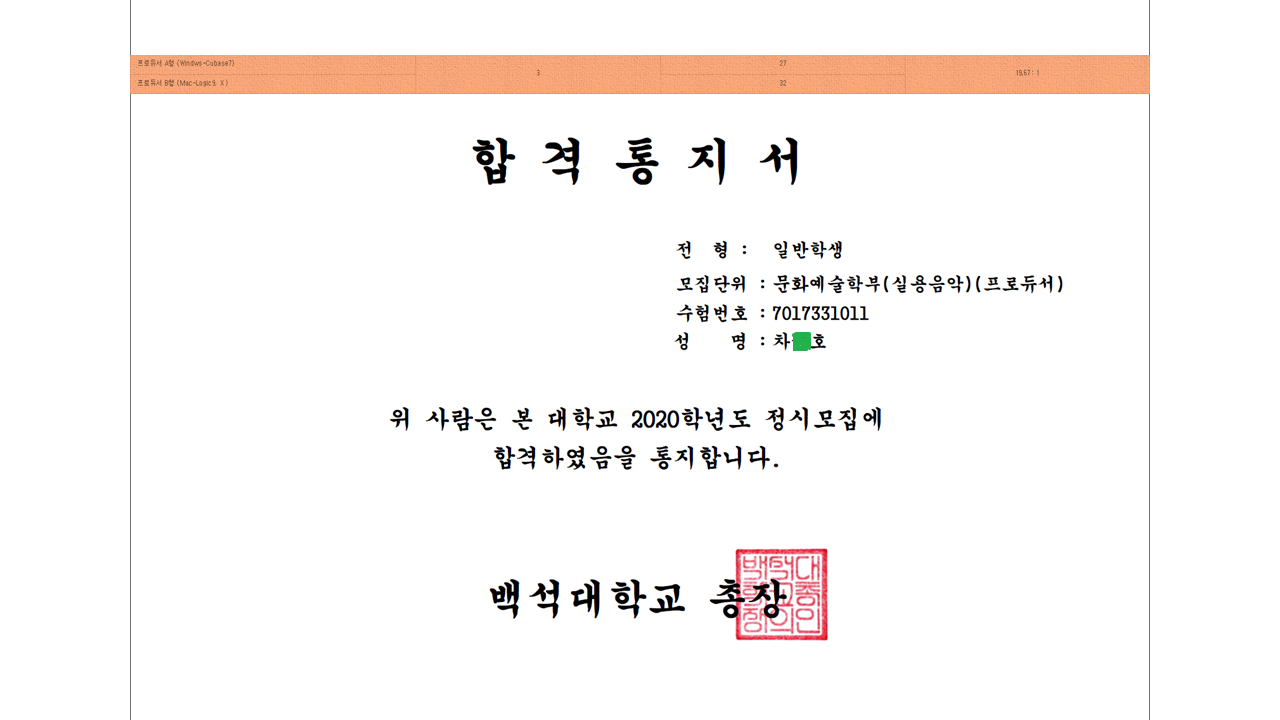 차*호 학생 2020학년도 백석대학교 프로듀서(미디) 전공 정시 최종 합격!!