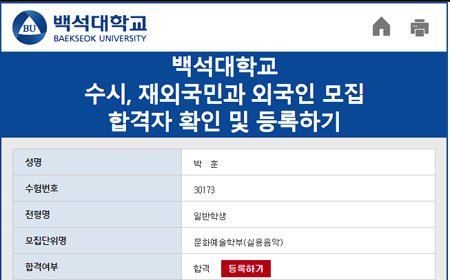 박*훈 학생 2023학년도 백석대학교 프로듀서(미디) 전공 수시 최종 합격!