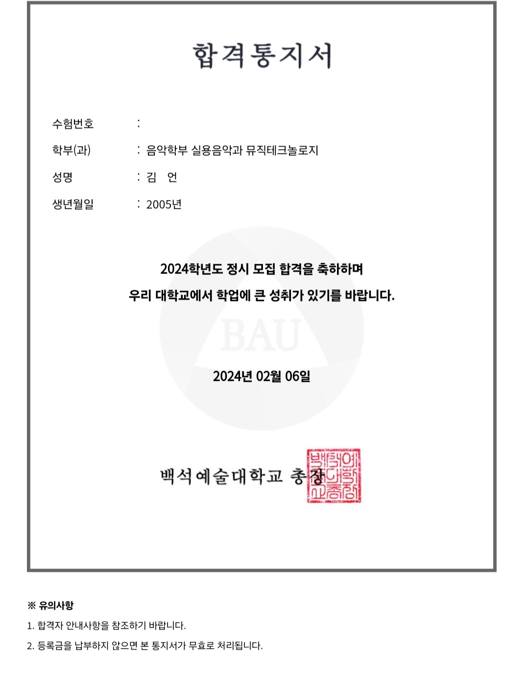24학년도 #백석예대 #백석예술대학교 실용음악학과 뮤직테크놀로지 전공 정시 최종 합격한 소식을 전합니다.